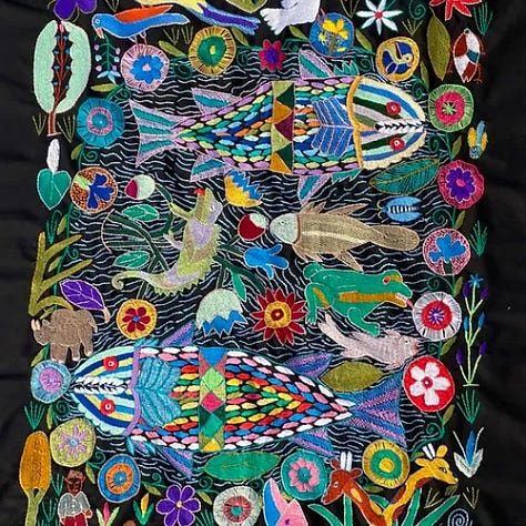 South African embroideries also draw inspiration from the natural world, often relaying folktales and mythology in brilliant colours against a black backdrop. They’re sort of like the cave painting rendered in fabric.