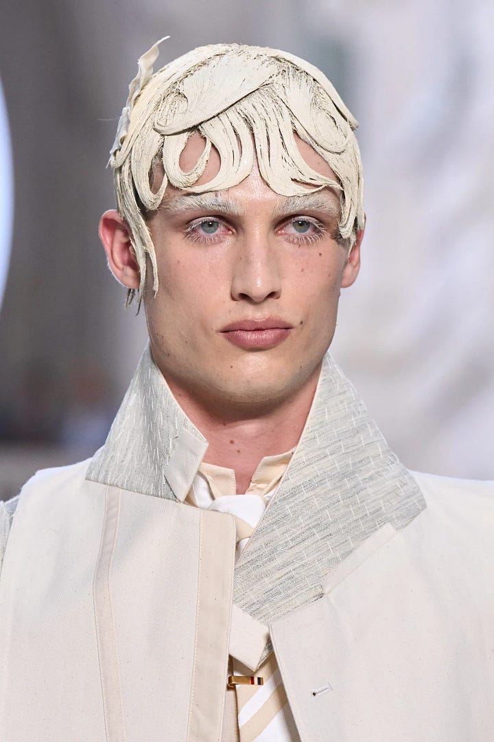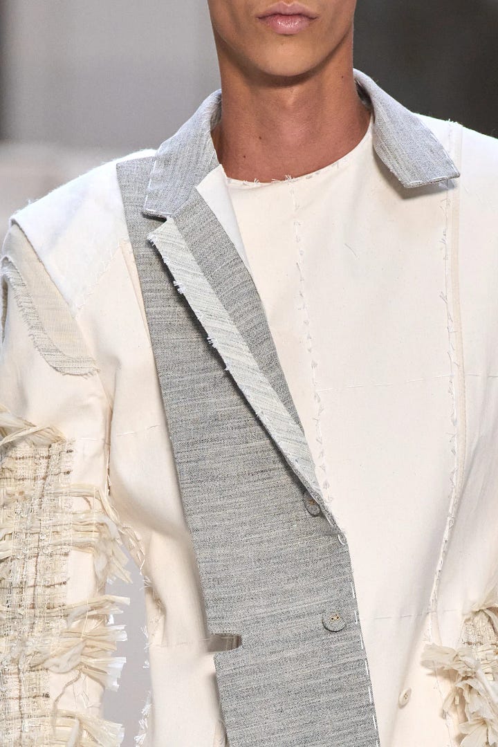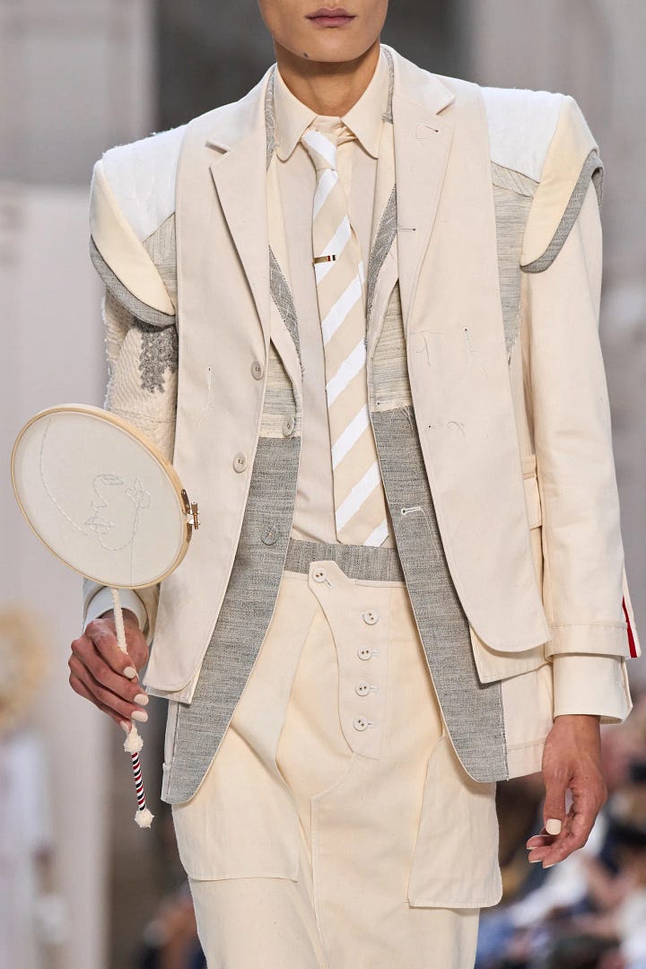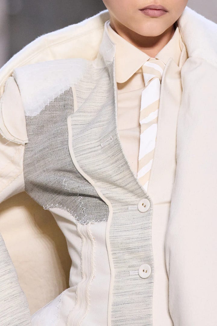 Thom Browne’s Autumn ‘24 Collection was a much needed reminder of this (just remembered this is a fashion newsletter). It’s literally an ode to the unglamourous, boring work that goes into couture. Permanent basting stitches, inside-out seams, exposed padding and interlining, and everything in calico (the go-to mock-up or tester fabric).